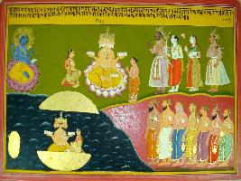 | Description / विवरण | Miniature painting based on Harivansha depicting Vishnu seated on lotus, Brahma seated on lotus with a woman and a sage on his either side. Two king with Narad and a lady coming near Brahma. In the lower part, Brahma and Saraswati are seen emerging from a golden ball in river and Saptarishis are standing on the bank. |