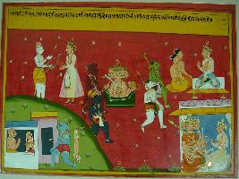 | Description / विवरण | Miniature painting based on Raghuvansha depicting a king receiving bow and arrow from Shiv on the right top corner and demon king Ravan has been seen in the centre of the painting seated in a Vayuyaan and at the left lower corner of the painting demon king Ravan sitting with the king. |