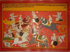 | Description / विवरण | Miniature painting based on Mahabharat - Bhishma parva depicting Bhim is fighting with the soldiers of Kalinga and killed many of them. |