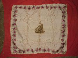 | Description / विवरण | It is a silk handkerchief with floral motives on the border. Portrait of a King in sitting position on chair is shown in the center of the handkerchief |