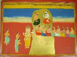 | Description / विवरण | Miniature painting based on Harivansha depicting Brahma standing and giving boon to a man, who was doing penance. Near them, eight rishis are seated on vimans. At the top part, two sages are sitting and talking on a hill. |