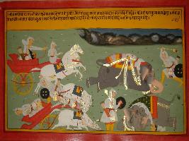 | Description / विवरण | Miniature painting based on Mahabharat - Bhishma parva depicting a scene of Kurukshetra war where many brave soldiers, horses, elephants are killed. On the painting Bhimsena is seen attacking on elephants. |