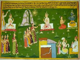 | Description / विवरण | Miniature painting based on Raghuvansha depicting seated on the right upper corner. On the left top corner, Vishnu is worshipped by a devotee, below it two men are seen seated, on its right a female deity standing in front of a house having a black snake. On the below right portion of the painting, many females are walking and then talking to the king. |
