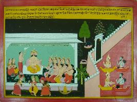 | Description / विवरण | Miniature painting based on Mahabharat - Sabha parva. It is depicts Narad telling Yudhisthir that one day he met Sun and he told him about the Sabha of Brahma. It also depicts Narad describing the Sabha of Brahma. |