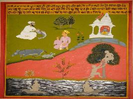 | Description / विवरण | Miniature painting based on Panchtantra depicting a man is cutting a fish with knife. A Vishnu temple is shown left side. Donkey and her kid is shown in the middle. Below a monkey is shown crossing the river on the back of the crocodile. |