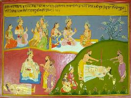 | Description / विवरण | Miniature painting based on Harivansha depicting Kashayap rishi giving curse to king at the lower right side and king is shown lying on ground. At the top right part, Raja Rucharu is seen sitting with his wife and six sons. To the left his eldest son Aang is shown sitting with his son Venu. |