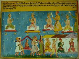 | Description / विवरण | Miniature painting based on Raghuvansha. On the upper part four seated royal figures are depicted with two having their attendants along. On the lower side some people taking a queen on palanquin after the swayambar. |