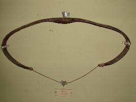 | Description / विवरण | It is a bow with moon shape arrow. The moon shape is at the top of the arrow. It is in launching position display. Arrow is made from iron. Cotton string is tied to bow. Arrow is in vertical condition existing in the middle of the bow. It is partially broken middle top. |