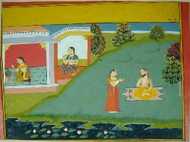 | Description / विवरण | Miniature painting based on Krishna charitra depicting a woman standing in front of sage who is sitting on lion skin at the left part of painting. At the right part, Women is depicted in their houses. one is shown cooking food and other is shown sitting and walking. At the lower level river is being depicted. |