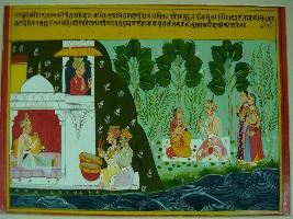| Description / विवरण | Miniature painting based on Raghuvansha. Here the king is depicted standing up in the balcony, and also depicted enjoying music played by the musicians sitting near the ocean. On the left side king is depicted sitting with his queen and two female attendants. |