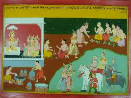 | Description / विवरण | Miniature painting based on Mahabharat - Sabha parva depicting Narad telling Yudhisthir that king Harishchandra, after defeating all countires, performed a great yagna many kings and Brahmans assembled. |