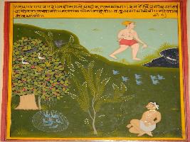 | Description / विवरण | Miniature painting based on Panchtantra depicting a story of bird and hunter. At the top a man is shown catching fish through net and below another hunter is catching birds in net. |