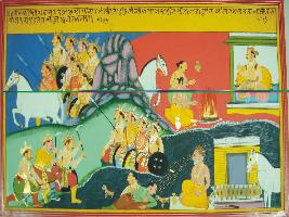 | Description / विवरण | Miniature painting based on Harivansha depicting some soldiers with the Ashwamegh horse in a maintain region, while two priests are performing Ashwamegh yagna and the king is seen in the upper left corner. A seated sage at the bank of a river is cursing the soldiers. |