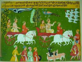| Description / विवरण | Miniature painting based on Raghuvansha. On the upper side a king and queen are depicted riding a chariot drawn by two horses. On the lower side four hunters with bows and arrows, knife and shield are standing in front of a group of deers. Then they are walking away. |