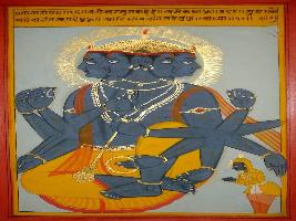 | Description / विवरण | Miniature painting based on Shri Bhagwat Gita. Vishwaroop form of Krishna who has many hands many heads while Arjun also seen who is in standing position by folded his hands. |
