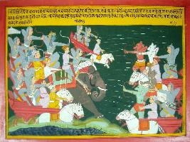 | Description / विवरण | Miniature painting based on Harivansha depicting war between Krishna s army on the right side and demon Alikumbha, Jarasandha, Shishupal on the left side. |