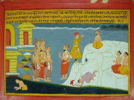| Description / विवरण | Miniature painting based on Mahabharat - Vana parva. The painting depicts came to Nandavan and meet Lomash rishi. On the other hand Pandavas saw a hill where may Sagar are worshipping. |