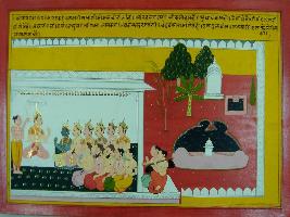 | Description / विवरण | Miniature painting based on Mahabharat - Sabha parva depicting Narad describing about the extension and beauty of yama s Sabha. He says that many suryavansi and chandravansi kings got saerved over there. |