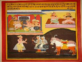 | Description / विवरण | Miniature painting based on Panchtantra depicting a king seeing the wounds of his sons and feeling hurt. |