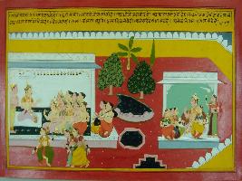 | Description / विवरण | Miniature painting based on Mahabharat - Sabha parva depicting that Narad describing about the extensoin and beauty of Indra s court. It also depicts Indra sitting in his court on a high throne and enjoying the dance of Apsaras. |