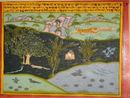| Description / विवरण | Miniature painting based on Panchtantra depicting the story of a jungle, where on top, a lion is depicted killing a deer. In central part a cooking of food is depicted. A snake is seen fighting with mongoose. In lower part a rat and birds are depicted. |
