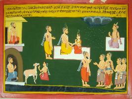 | Description / विवरण | Miniature painting based on Mahabharat - Vana parva depicting the ashram of rishi Vishwamitra and the marriage of daughter Lumpad while Pandavas are seen coming to meet Vishwamitra. |