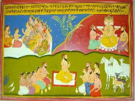 | Description / विवरण | Miniature painting based on Harivansha depicting Dashap sitting with ten men at the upper right corner. At the upper left part, Brahma is shown sitting in the middle of Devrishi Brihaspati and Danav guru Shukracharya. At the lower side, Dashap rishi is sitting in between and at the two sides sages and Devtas are shown sitting. |