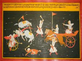 | Description / विवरण | Miniature painting based on Mahabharat - Bhishma parva depicting fight betwen Dhristadyumana and Dronacharya who are fighting with arrows. Dronacharya break Dhristadyumana s bow, then they start fighting with gada. |