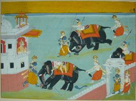 | Description / विवरण | Miniature painting based on Krishna charitra, depiction of Krishna killing an elephant in Mathura and Kansa watching it from the top of his palace. |