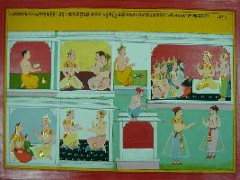 | Description / विवरण | Miniature painting based on Mahabharat - Sabha parva depicting Narad telling that Veda is sucessful with Agnihotra, wife is successful by son, wealth is successful by alms and lfe is successful by good behavior. |