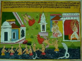 | Description / विवरण | Miniature painting based on Raghuvansha depicting at the upper left side king Ugrasena talking with two men. The lower part shows king Ugrasena taking bath in Yamuna with his queens and Kaliya naga giving a Mani to him. Garuda is depicted talking to Ugrasena and flying back to Vishnu. |