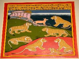 | Description / विवरण | Miniature painting based on Panchtantra depicting the story of a lion and jackal, and jackal eats the prey with his family. |