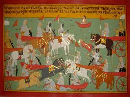| Description / विवरण | Miniature painting based on Mahabharat - Bhishma parva. Dhristadyumana is depicted coming towards Drona and Bhishma then Arjun is coming towards them. king Duryodhan is telling Bhishma that today Dhristadyumana and Arjun are looking very fierce and will destroy their army and blaming Bhishma for not allowing Karna to fight in the war. |