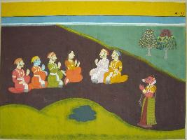 | Description / विवरण | Miniature painting based on Krishna charit depicting five men sitting with a woman. in the centre and a female with animals head also is depicted along with. |