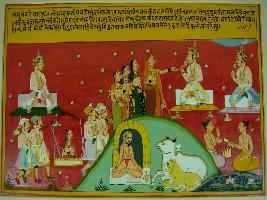 | Description / विवरण | Miniature painting based on Raghuvansha depicting Pratipdhan at the upper right side, to meet him beautiful Indumati has come depicted at the left side. Sunansa, the princess of Surasena kingdom has also come in a Palanquin depicted at the lower right side. the painting also depicts Brahmans doing yagna and a sage in meditation at the lower part. |