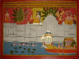 | Description / विवरण | Miniature painting based on Mahabharat - Vana parva depicting two queen are going to ashram of Vaispayan rishi. They are shown going to ashram in a boat at lower level. At upper level, They are meeting Kashayap rishi in ashram and shown talking to him and asking about motive of their coming. He have them his boon mixed in food and then embraced them. |