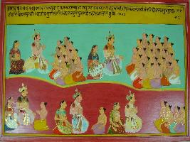 | Description / विवरण | Miniature painting based on Harivansha depicting Bhandhar and his forty two sons in two parts. He is seated with his queens. |
