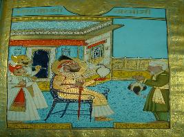 | Description / विवरण | Miniature painting depicting Maharana Shri Sarji in sitting position on chair followed by two male attendant. The painting depicts that Shri Sarji has a hen in his left hand and talking with a man who catches hens. |