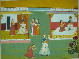 | Description / विवरण | Miniature painting based on Krishna charit. Krishna is depicted with Radha once sitting inside a palace and once standing inside a palace with two gopis and once in a courtyard and Radha is depicted bending towards him. |