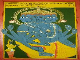 | Description / विवरण | Miniature painting based on Shri Bhagwat Gita. Krishna is depicted wearing many divya malas and clothes. He has endless faces. |
