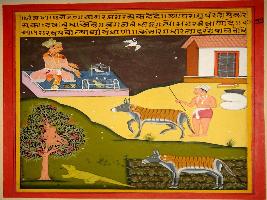 | Description / विवरण | Miniature painting based on Panchtantra depicting scenes- monkey sitting on tree telling stories to crocodile at lower left portion, a donkey wearing tiger skin and moving in field at the lower right portion above it, donkey chasing away by farmer and in extreme upper left a man probably Jyotish is with parrot and a bird. |