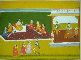 | Description / विवरण | Miniature painting based on Krishna charit depicting the Gopa Raja Nanda that talking with five Gopas. While Krishna is seen asking something to his mother Yashoda in Kitchen. in the lower part of the painting Krishna is seen followed by three persons. |