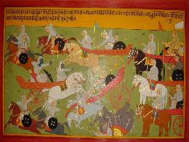 | Description / विवरण | Miniature painting based on Mahabharat - Bhishma parva depicting Arjun telling Krishna to take his chariot towards Bhishma and Krishna taking his chariot towards Bhishma. Arjun crushed the army of Sindhu desh and reached near Bhishma and fight fiercely. |