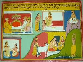 | Description / विवरण | Miniature painting based on Harivansha depicting Vishwamitra with his son Satyavarta in a palace at the lower right part. Above them, a vacant throne is depicted with nobles sitting near by. To its left, wife of Vishwamitra, with two sons, is seen talking to him. In the lower side, She is shown sitting with her sons. At the extreme left, Vishwamitra is shown doing penance. |