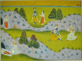 | Description / विवरण | Miniature painting based on Krishna charit depicting Krishna and Kaljavan, Where Krishna ran way towards the cave Where the king Muchkand was sleeping. |