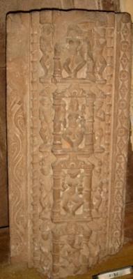 | Description / विवरण | Fragment of doorjamb depicting Matrikas in vertical row in pillared niche. From top i unidentified because defaced, flanked by celestial musicals ii Indri holding Pash, ankush and Shrifal and flanked attendants iii Varahi holding mace, lotus and pitcher and flanked by celestial figures iv Chamunda, holding dagger Kharbhanga and flanked by Ganesh on left side and celestial figure on right side. |