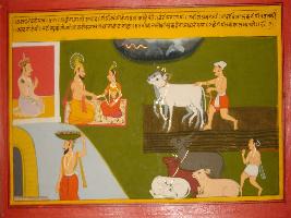 | Description / विवरण | Miniature painting based on Mahabharat - Vana parva. This painting is depicting Lomapada is giving his daughter to a rishi. At the same time, clouds are coming and rain started pouring. This scene is depicted at upper part. At the extreme left, villagers are shown ploughing field and taking cows. At the lower right part, Vibhamiak rishi shown going back to his house. |