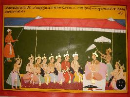 | Description / विवरण | Miniature painting based on Mahabharat - Bhishma parva depicting looking to the chakravyuha of Pandavas, Kripa charya, Dronacharya, Shalya and Duryodhan deciding to protect Bhishma. |