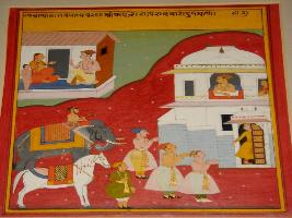 | Description / विवरण | Miniature painting based on Panchtantra depicting a mother and child talking to a man may be father in front of their little home. Below it king and queen is seen in the palatial colony. They received a royal procession that made by three men and an elephant and a horse. |