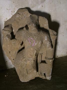 | Description / विवरण | This is an human figurine carved with a human figure Male in high relief. Its face is chipped off and lower part below the knee is missing. He is richly ornamented and in tribhangi posture. |